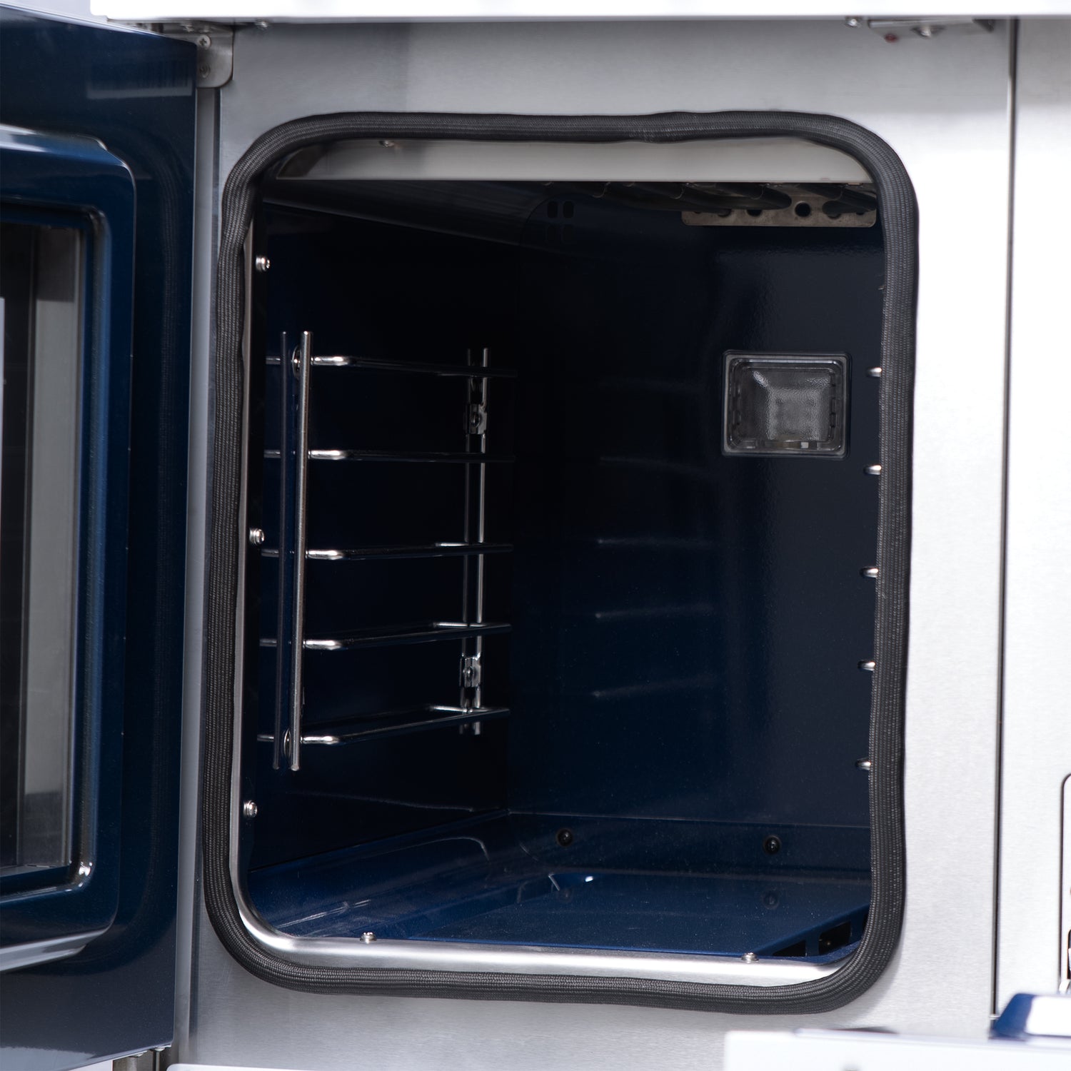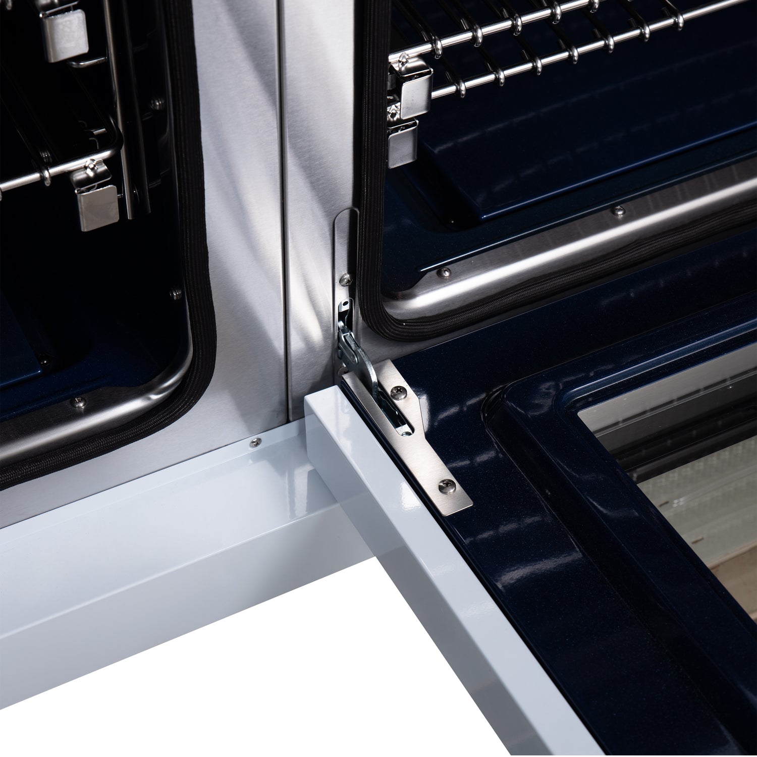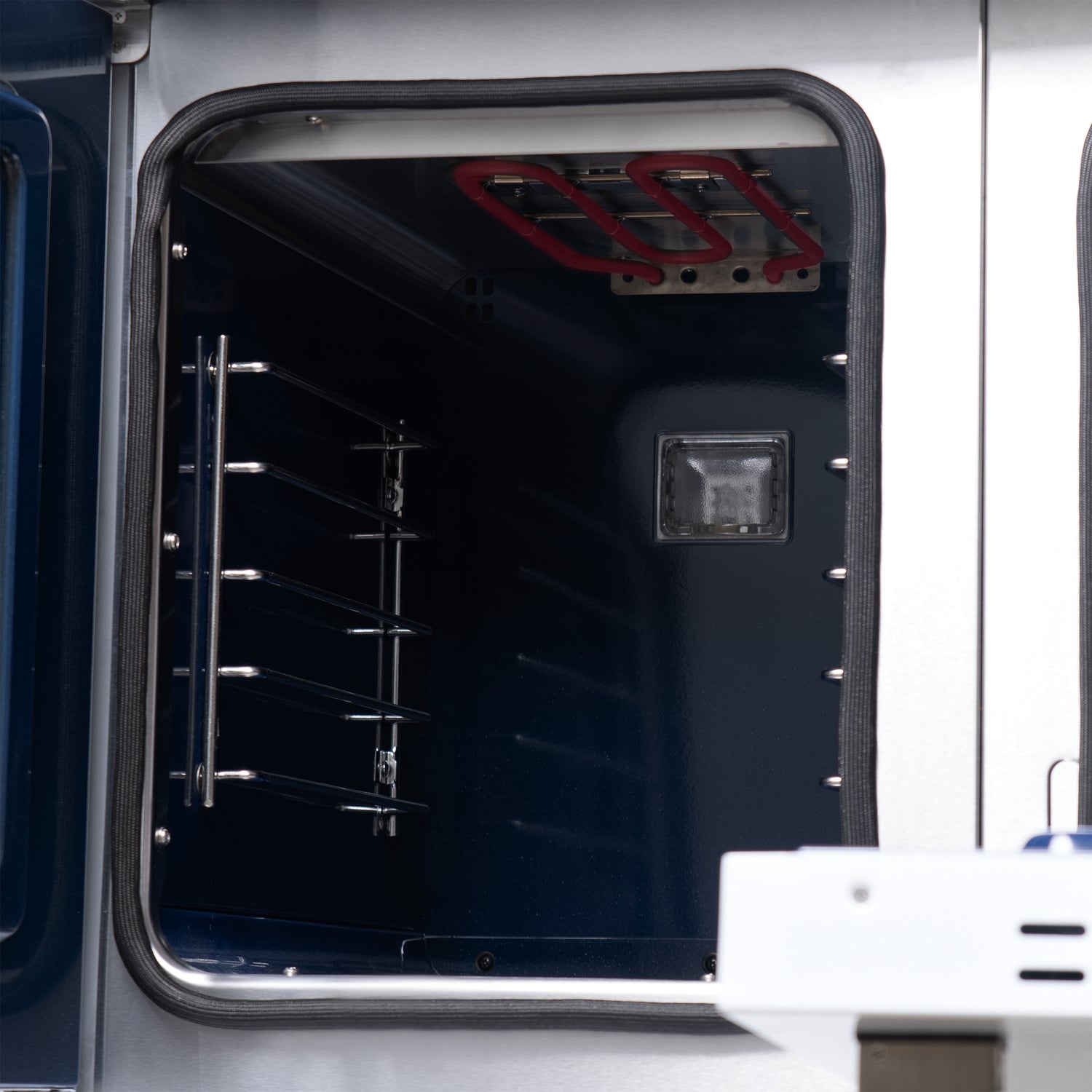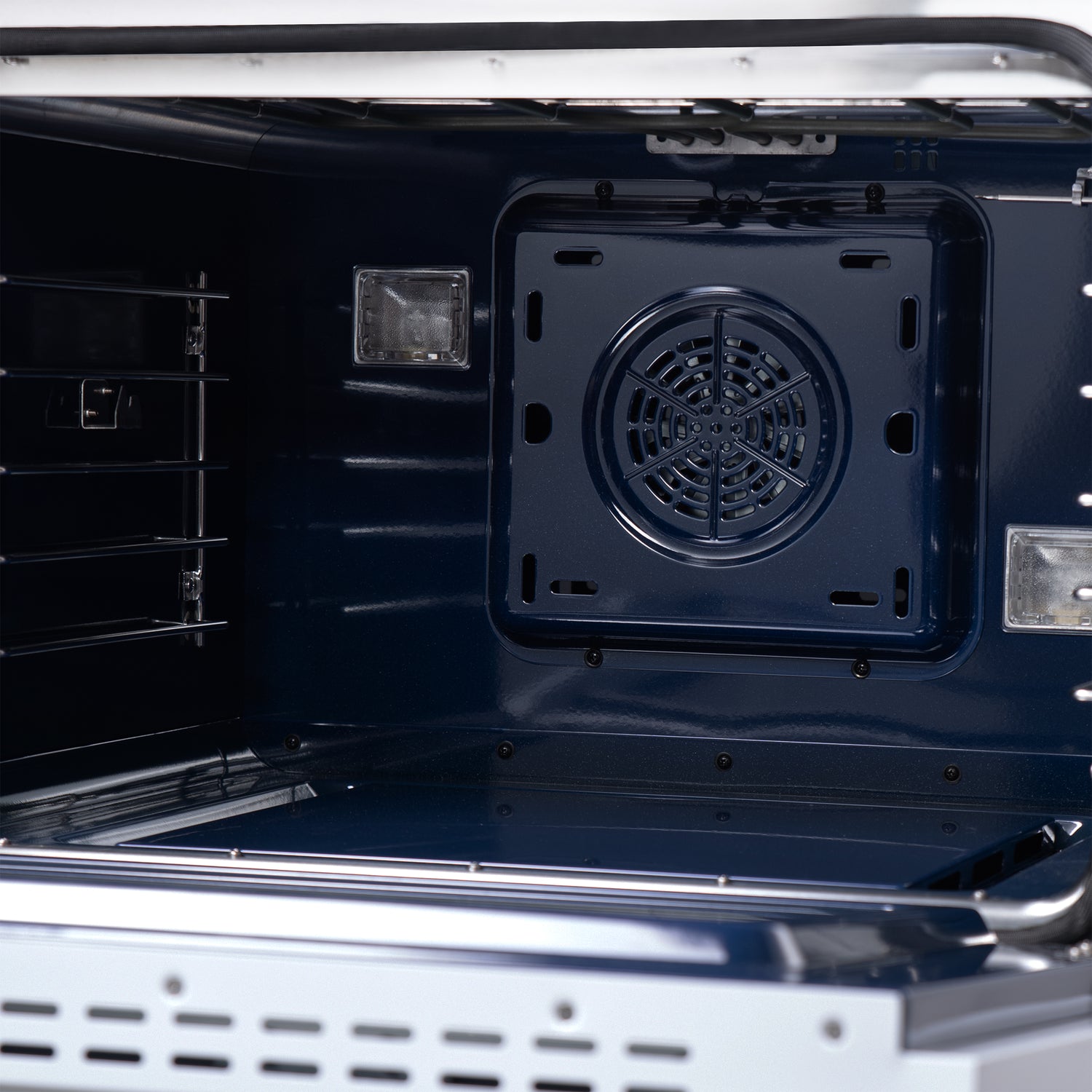 • 6.58 cu. ft. True Convection Oven: Dual ovens with durable speckled blue enamel interiors, triple-layer glass doors, and true convection in the right oven for consistent, even cooking.
