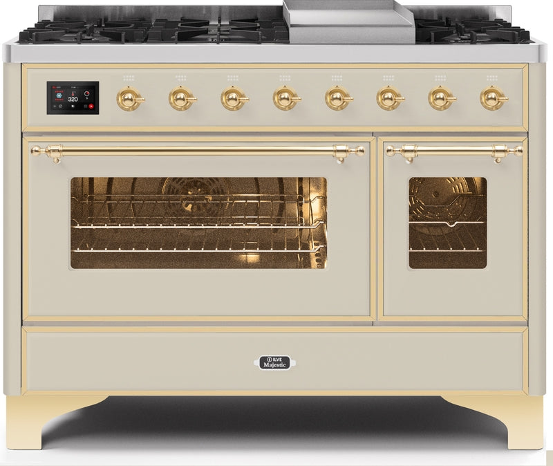 ILVE Majestic II 48" Dual Fuel Natural Gas Range in Antique White with Brass Trim, UM12FDNS3AWG