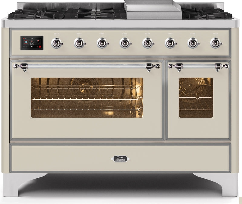 ILVE Majestic II 48" Dual Fuel Natural Gas Range in Antique White with Chrome Trim, UM12FDNS3AWC