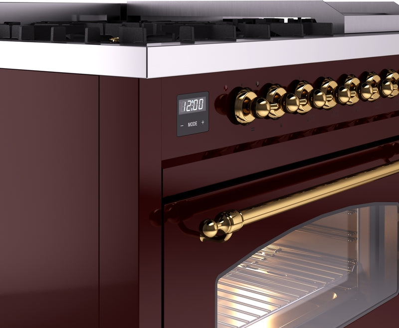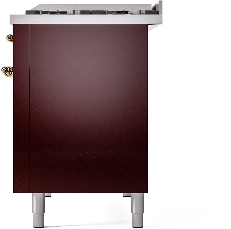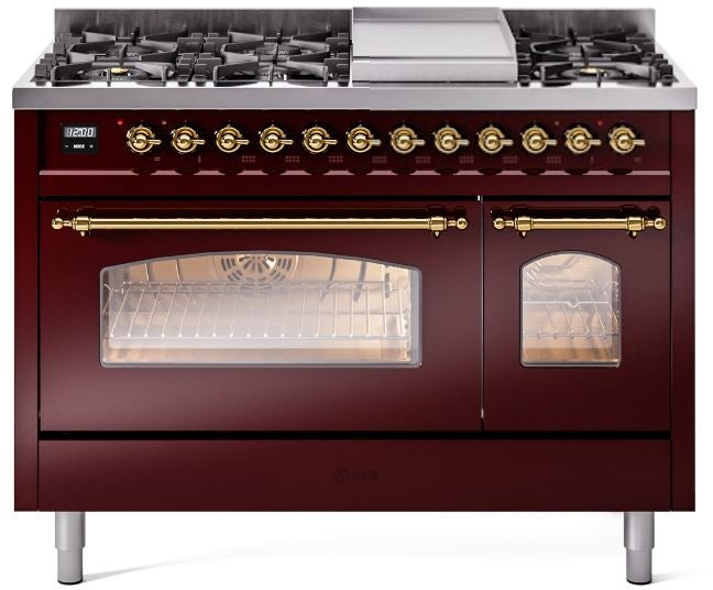 ILVE Nostalgie II 48" Dual Fuel Natural Gas Range in Burgundy with Brass Trim, UP48FNMPBUG