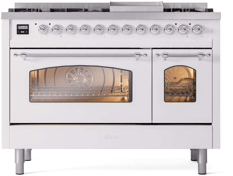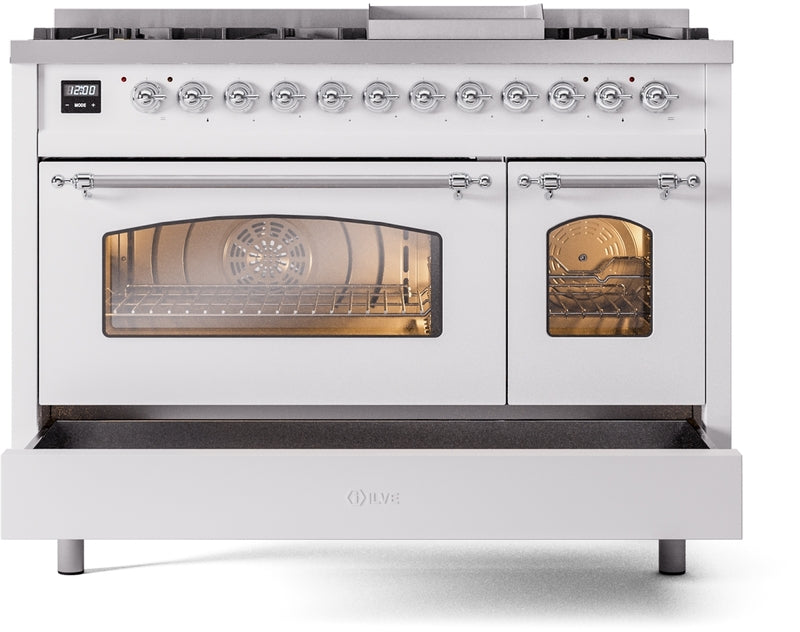 ILVE Nostalgie II 48" Dual Fuel Natural Gas Range in White with Chrome Trim, UP48FNMPWHC