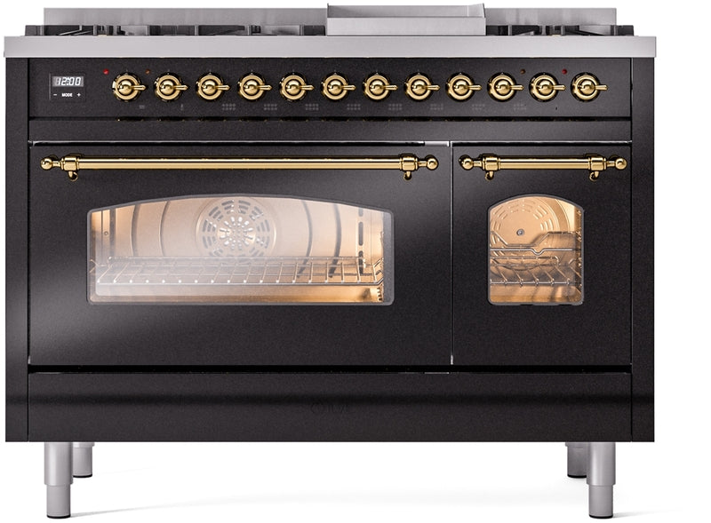 ILVE Nostalgie II 48" Dual Fuel Propane Gas Range in Black with Brass Trim, UP48FNMPBKGLP