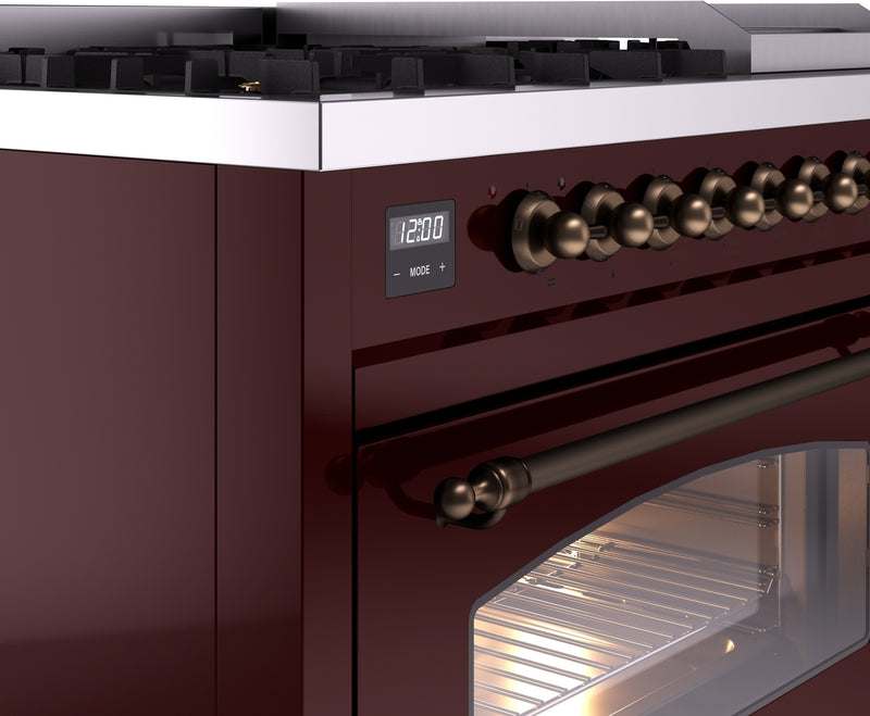 ILVE Nostalgie II 48" Dual Fuel Propane Gas Range in Burgundy with Bronze Trim, UP48FNMPBUBLP