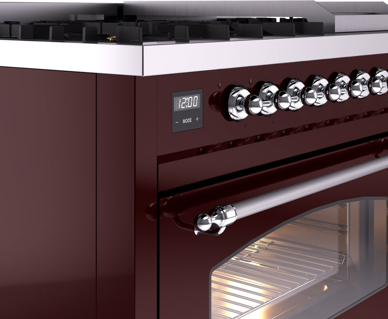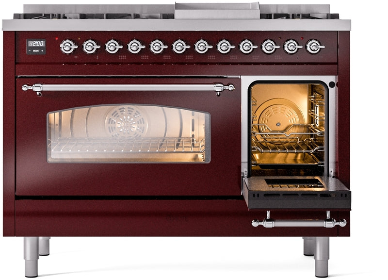 ILVE Nostalgie II 48" Dual Fuel Propane Gas Range in Burgundy with Chrome Trim, UP48FNMPBUCLP
