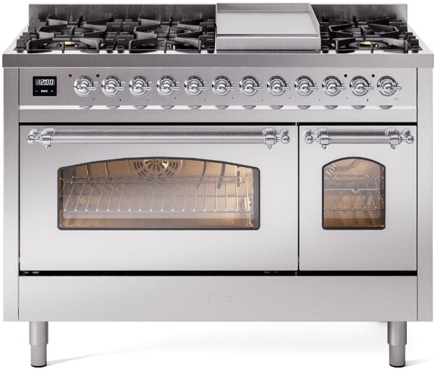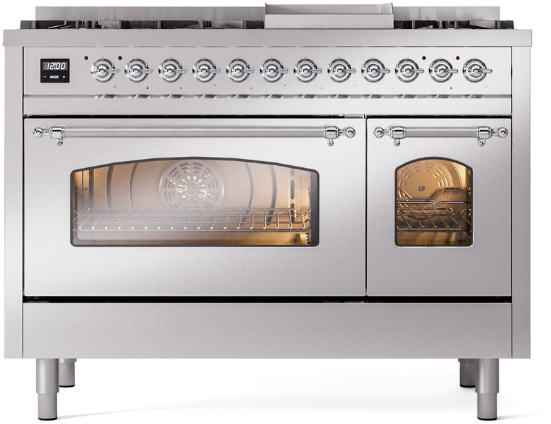 ILVE Nostalgie II 48" Dual Fuel Propane Gas Range in Stainless Steel with Chrome Trim, UP48FNMPSSCLP