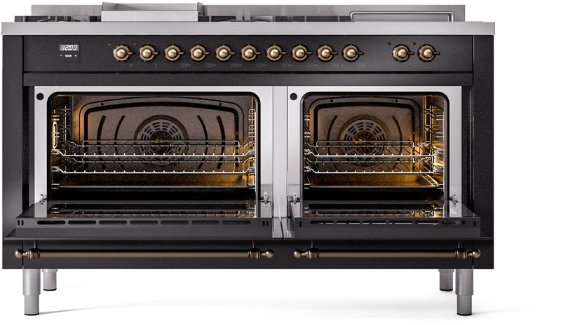 ILVE Nostalgie II 60" Dual Fuel Natural Gas Range in Glossy Black with Bronze Trim, UP60FSNMPBKB