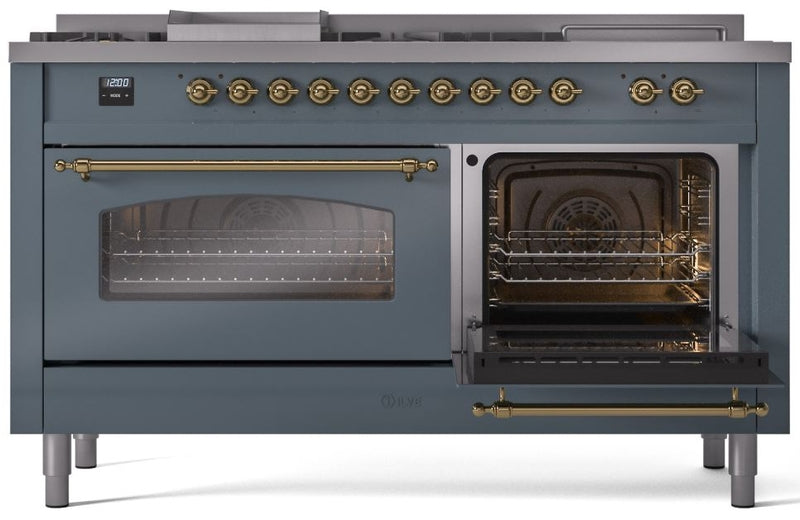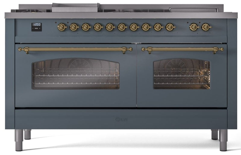 ILVE Nostalgie II 60" Dual Fuel Natural Gas Range in Blue Grey with Brass Trim, UP60FSNMPBGG