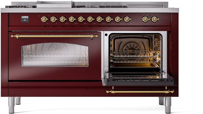 ILVE Nostalgie II 60" Dual Fuel Natural Gas Range in Burgundy with Brass Trim, UP60FSNMPBUG