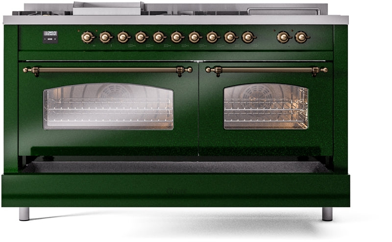ILVE Nostalgie II 60" Dual Fuel Natural Gas Range in Emerald Green with Bronze Trim, UP60FSNMPEGB
