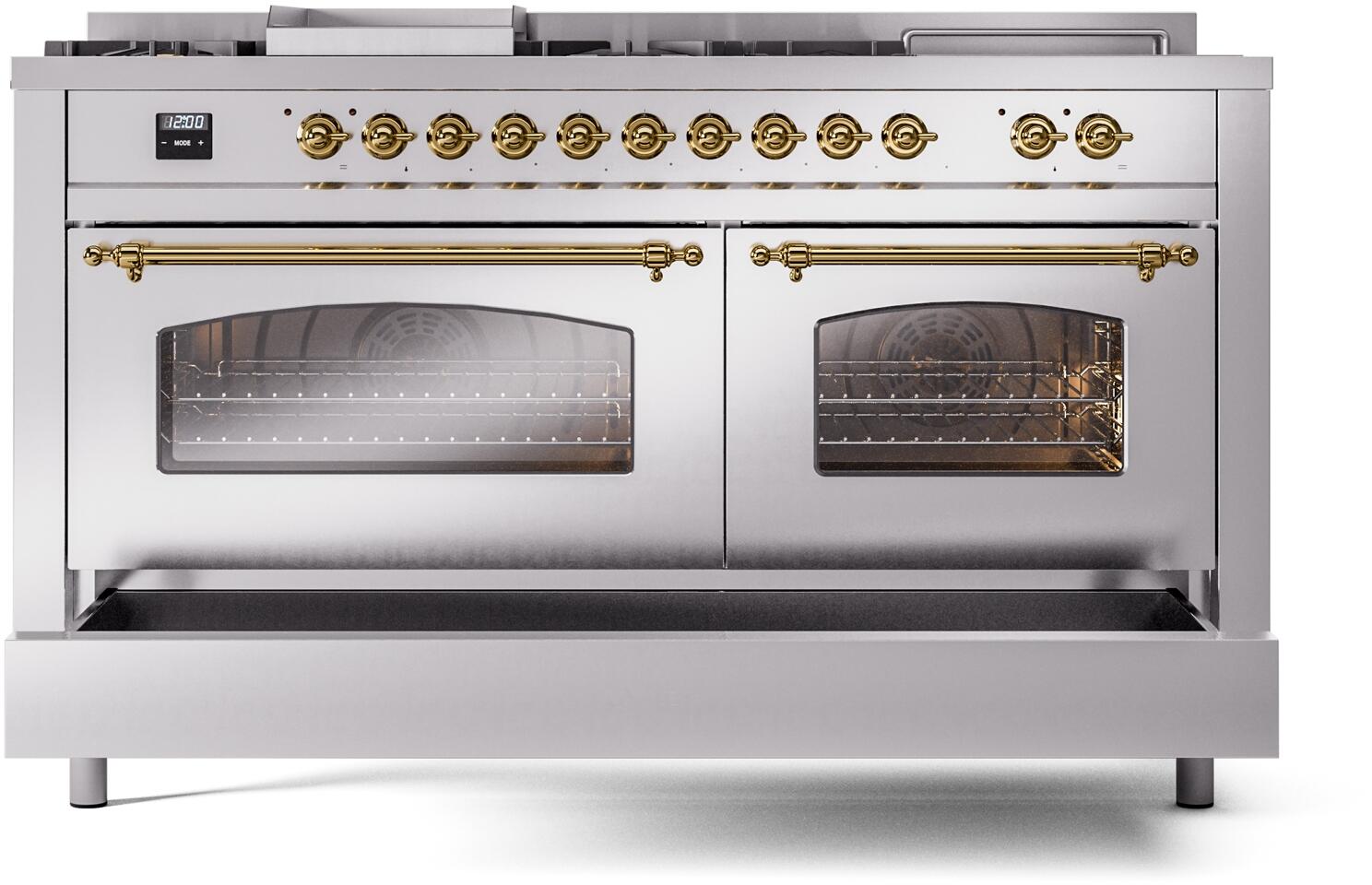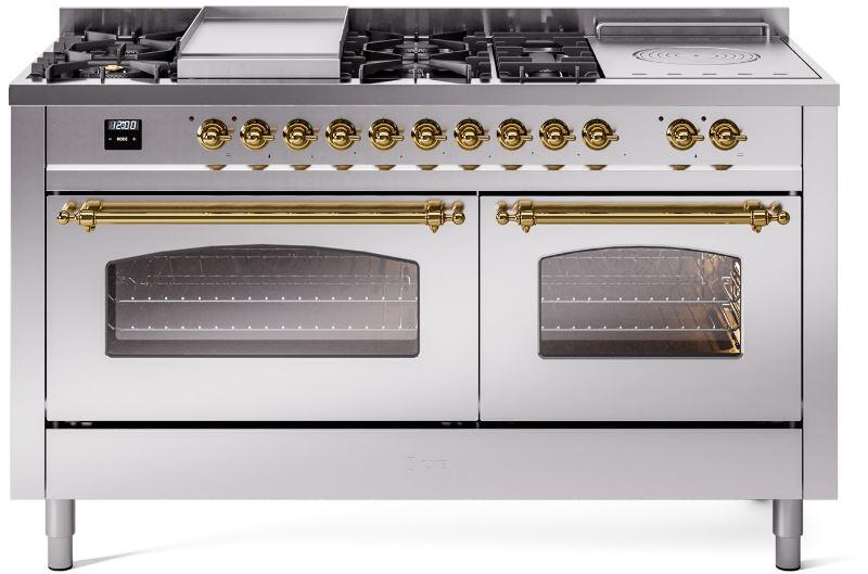 ILVE Nostalgie II 60" Dual Fuel Natural Gas Range in Stainless Steel with Brass Trim, UP60FSNMPSSG