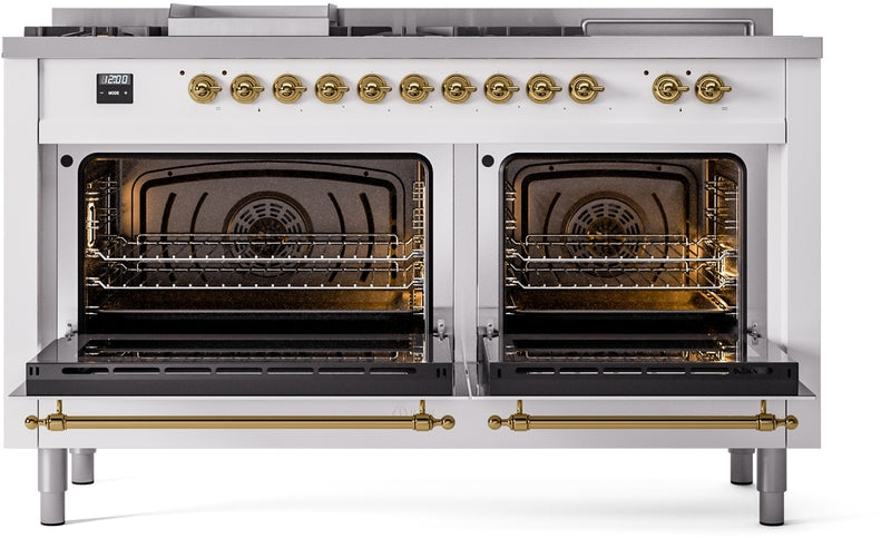 ILVE Nostalgie II 60" Dual Fuel Natural Gas Range in White with Brass Trim, UP60FSNMPWHG