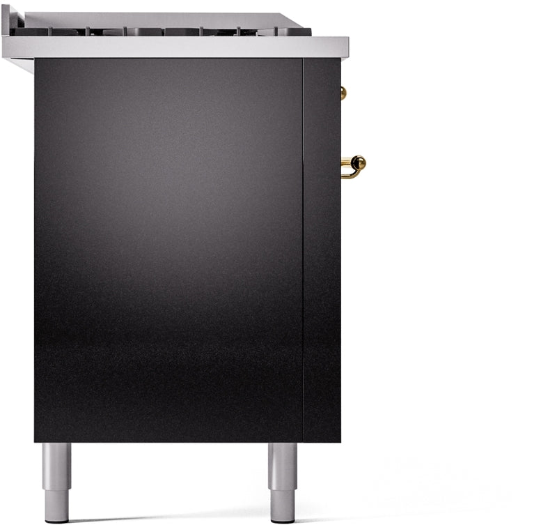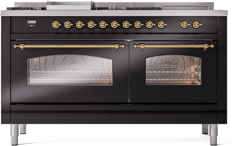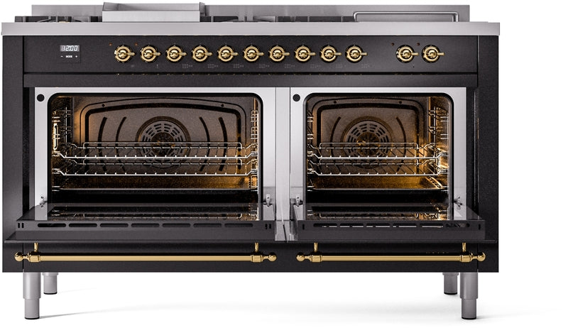 ILVE Nostalgie II 60" Dual Fuel Propane Gas Range in Glossy Black with Brass Trim, UP60FSNMPBKGLP