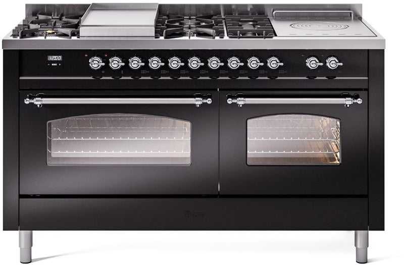 ILVE Nostalgie II 60" Dual Fuel Propane Gas Range in Glossy Black with Chrome Trim, UP60FSNMPBKCLP