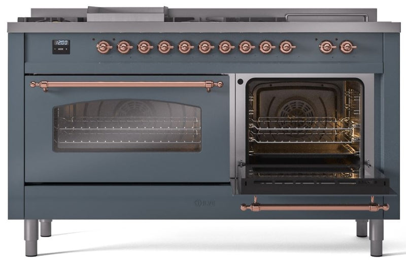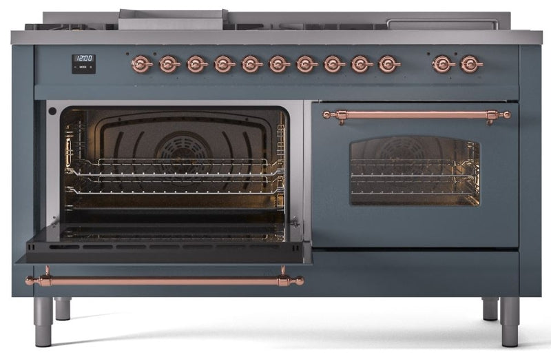 ILVE Nostalgie II 60" Dual Fuel Propane Gas Range in Blue Grey with Copper Trim, UP60FSNMPBGPLP