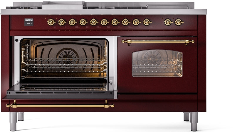 ILVE Nostalgie II 60" Dual Fuel Propane Gas Range in Burgundy with Brass Trim, UP60FSNMPBUGLP