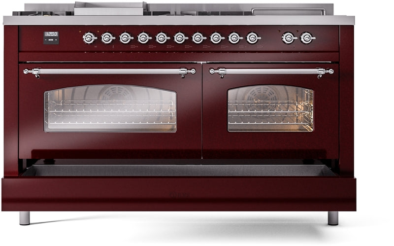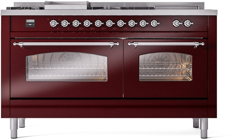 ILVE Nostalgie II 60" Dual Fuel Propane Gas Range in Burgundy with Chrome Trim, UP60FSNMPBUCLP