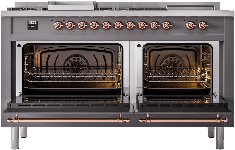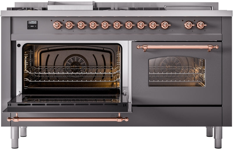 ILVE Nostalgie II 60" Dual Fuel Propane Gas Range in Matte Graphite with Copper Trim, UP60FSNMPMGPLP