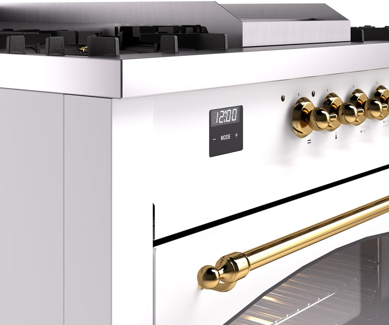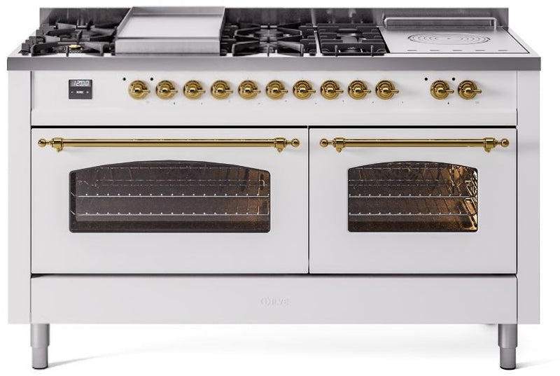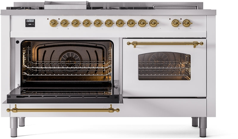ILVE Nostalgie II 60" Dual Fuel Propane Gas Range in White with Brass Trim, UP60FSNMPWHGLP