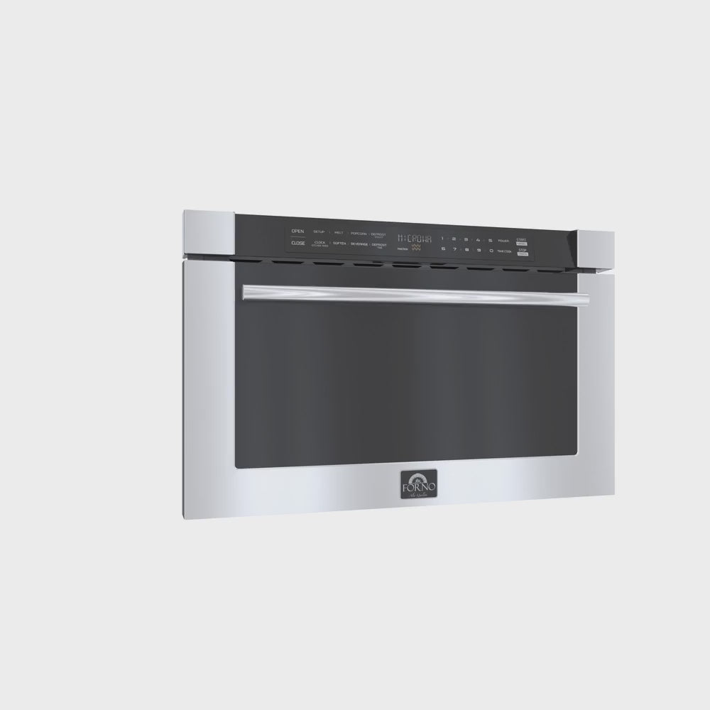 Upgrade your kitchen with the Forno Capolivera 24" Microwave Drawer, designed for effortless cooking. Featuring a 1.2 cu. ft. capacity, this stainless steel microwave with black accents delivers 1,000 watts of power for fast, even heating—boiling water in just 1 minute and 50 seconds. With 11 power levels, you can precisely control cooking temperatures for everything from reheating to gourmet prep. Glass touch controls and an LED display offer a modern, user-friendly experience, while pre-programmed settings make it easy to melt butter, chocolate, and more. Enjoy versatile cooking modes, including defrost, popcorn, and beverage heating. The spacious interior accommodates 7-inch coffee mugs and 16 x 16-inch dishes, making it perfect for everyday use.