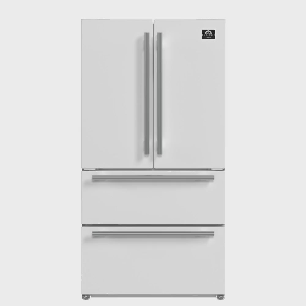 Have a stylish and efficient refrigerator in your kitchen with Forno Espresso's 36-inch White French Door Refrigerator. Its sleek design features customizable handles and advanced features, such as an automatic ice maker and fast cooling functions, while providing plenty of space with 19.2 cu.ft. capacity and adjustable shelving. Get energy efficiency and precise temperature control with ENERGY STAR certification and an inverter compressor, and easily organize with see-through drawers and door bins. Plus, brighten up your kitchen with high-efficiency LED lighting.