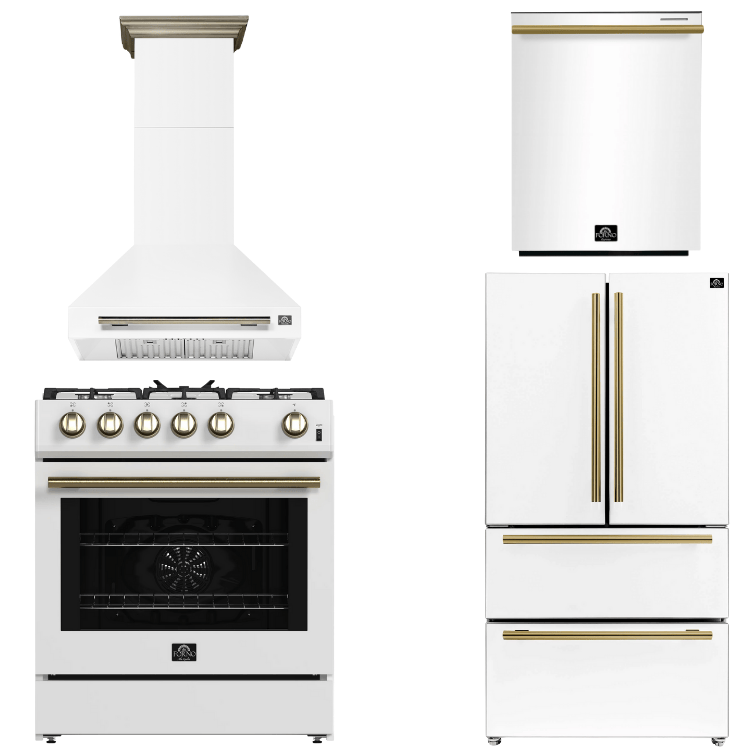 FORNO Espresso Package - 30" Gas Range, Wall Mount Range Hood, 36" Refrigerator with Ice Maker and Dishwasher in White with Antique Brass Accents, AP4-1116WHT-A15