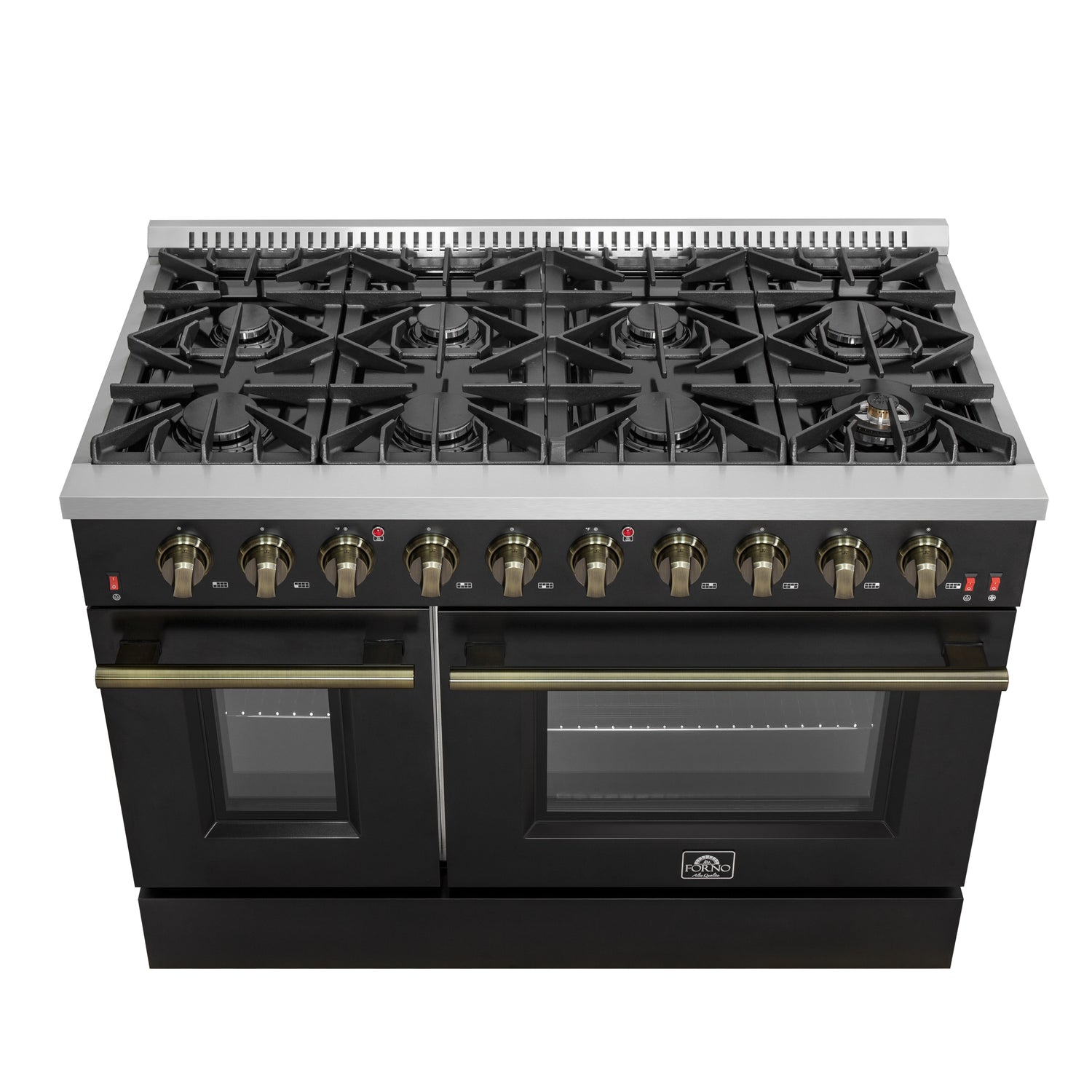 The Forno Galiano 48" Gas Range in crisp black with antique brass accents is a harmonious blend of classic elegance and high-performance functionality. Its timeless design, featuring a striking combination of a black finish, antique brass knobs and handles, and contrasting black and stainless steel details, brings sophistication and durability to any kitchen. Equipped with eight powerful sealed burners and a spacious convection oven, this range offers versatility, efficiency, and ease of use for any cooking task.