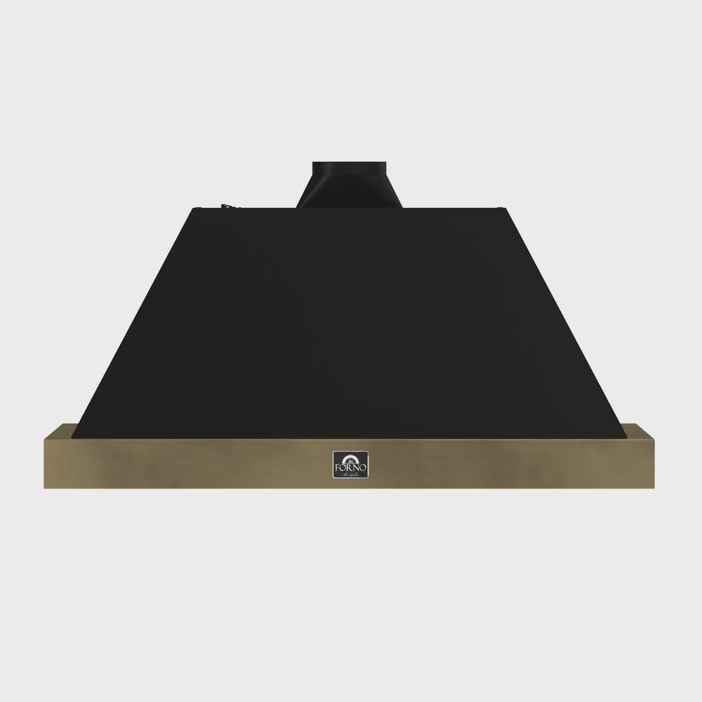 Upgrade your kitchen with Vittorio 48" Range Hood. Powerful 600 CFM motor clears smoke, odors and grease. Intuitive 3-speed fan and easy-to-clean baffle filters. Touch and remote control options. Energy-efficient LED lights and low-noise design. Chic black finish with antique brass detailing. Versatile installation options. 2-year warranty. Efficient design lowers energy costs.