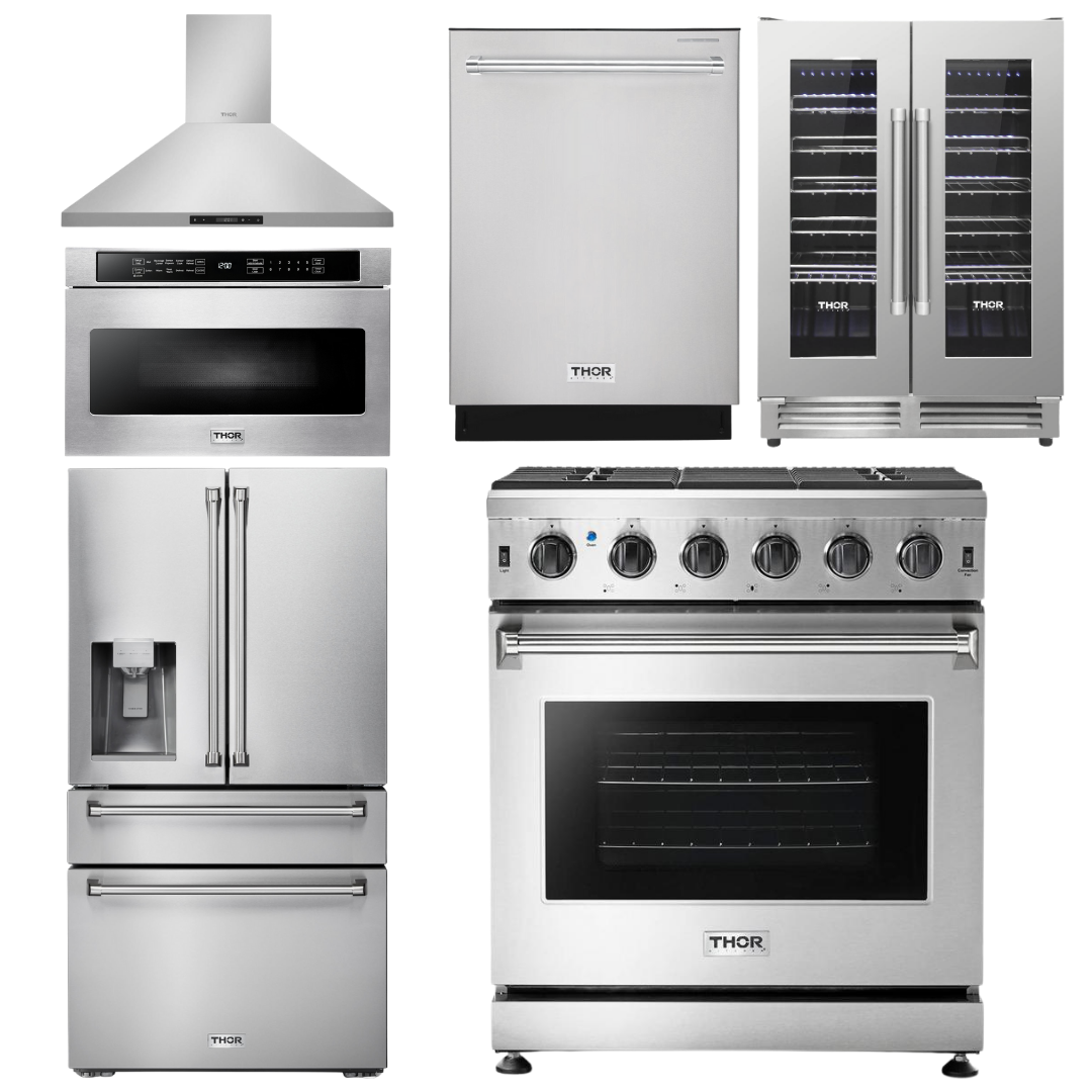 THOR Package - 30" Propane Gas Range, Range Hood, Microwave, Refrigerator, Dishwasher, Wine Cooler