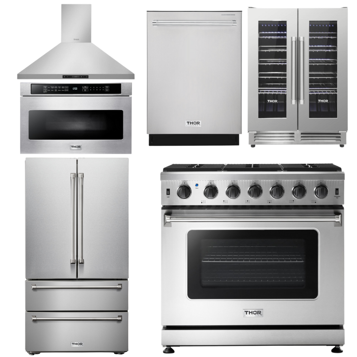 THOR Kitchen Package - 36" Propane Gas Range, Range Hood, Microwave, Refrigerator, Dishwasher, Wine Cooler, AP-LRG3601ULP-8