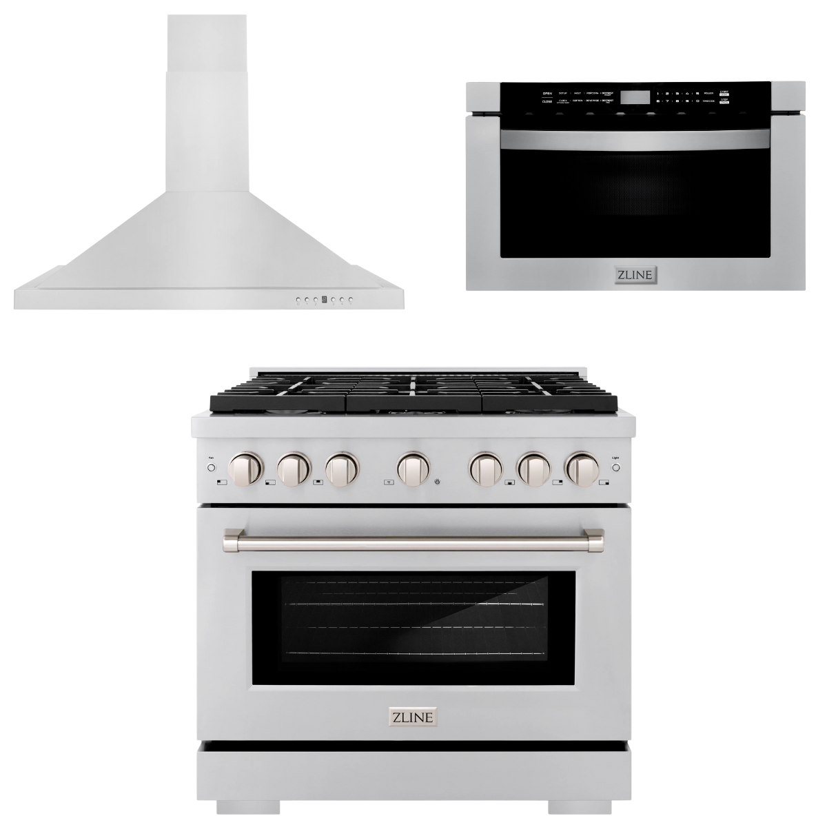 ZLINE Appliance Package - 36 in. Gas Range, Range Hood and Microwave Drawer, 3KP-SGRRH36-MW