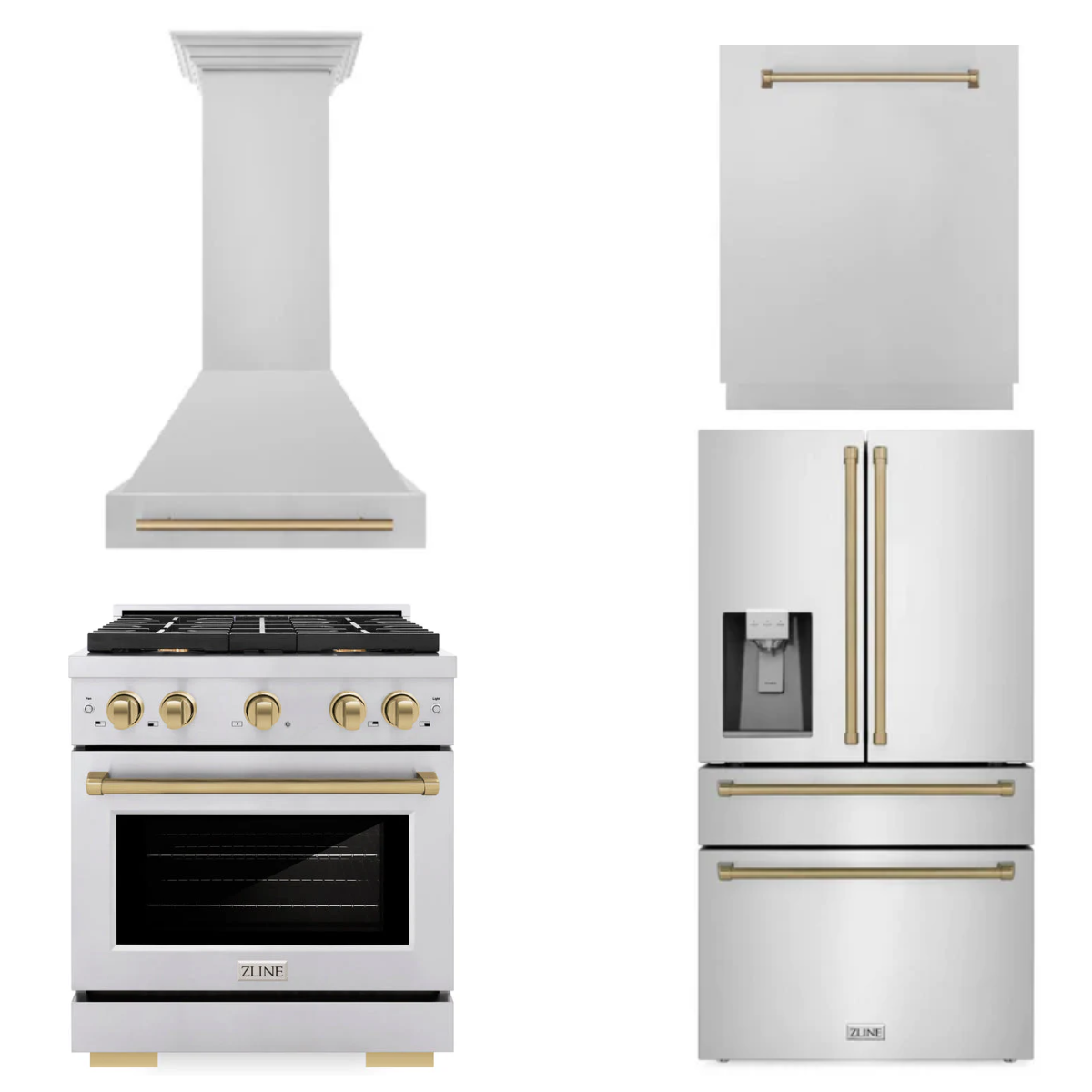 ZLINE Autograph Package - 30" Gas Range, Range Hood, Refrigerator with Water and Ice Dispenser, Dishwasher with Bronze Accents