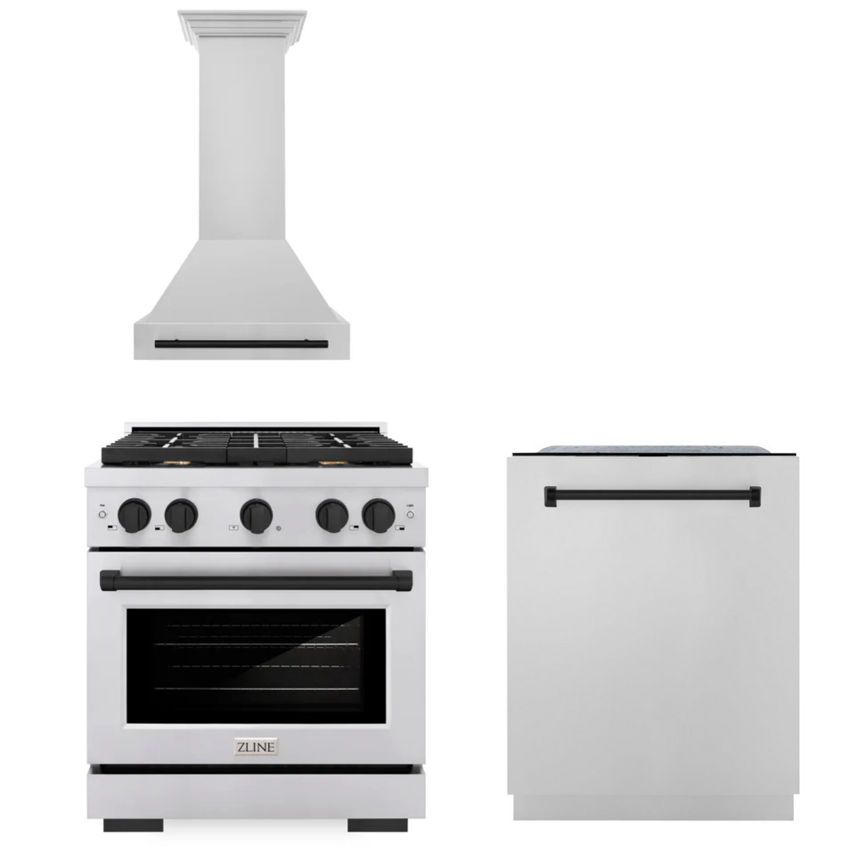 ZLINE Autograph Package - 30 In. Gas Range, Range Hood, Dishwasher in Stainless Steel with Matte Black Accents, 3AKP-RGRHDWM30-MB