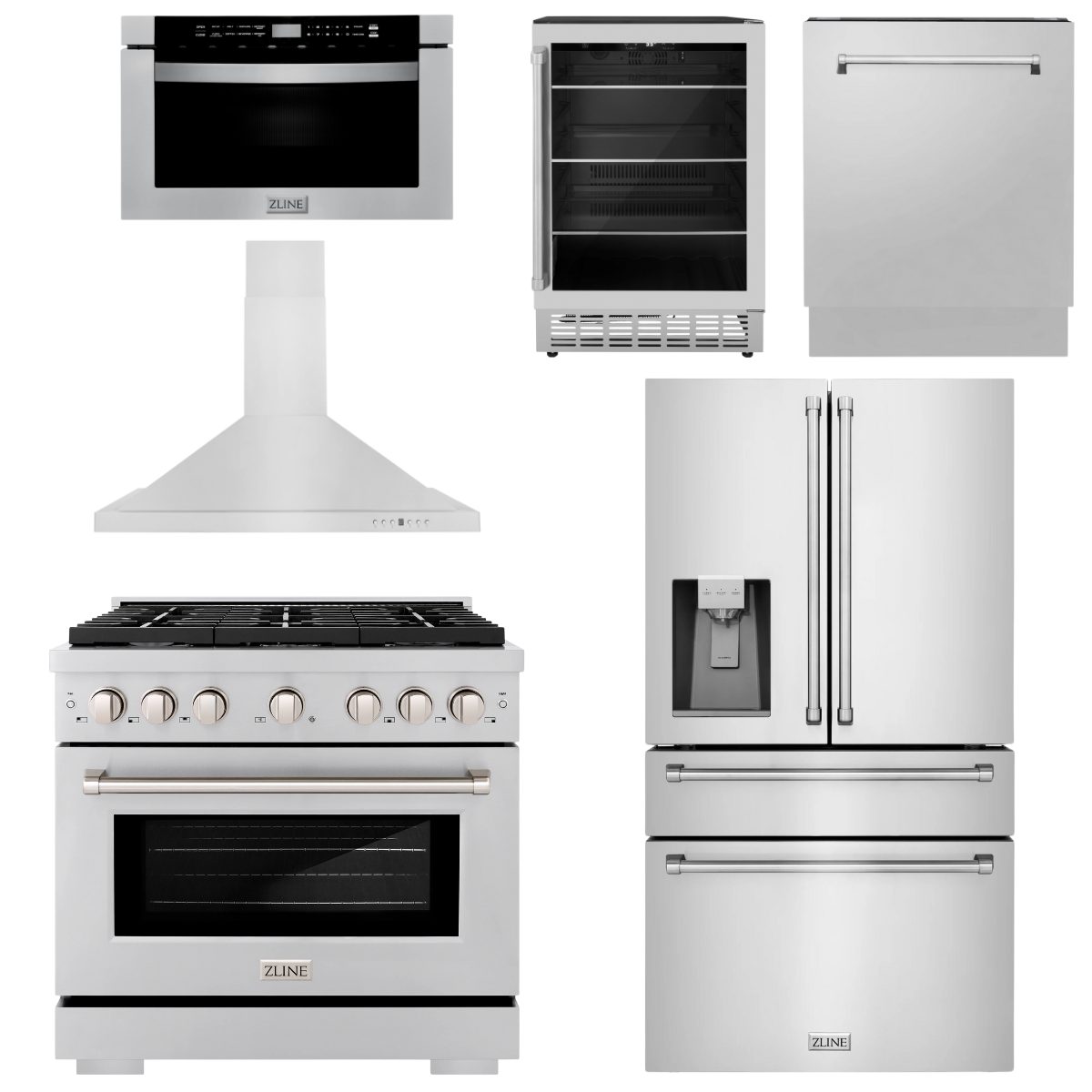 ZLINE Appliance Package - 36" Gas Range, Range Hood, Refrigerator with Water and Ice Dispenser, Microwave Drawer, Dishwasher and Beverage Fridge