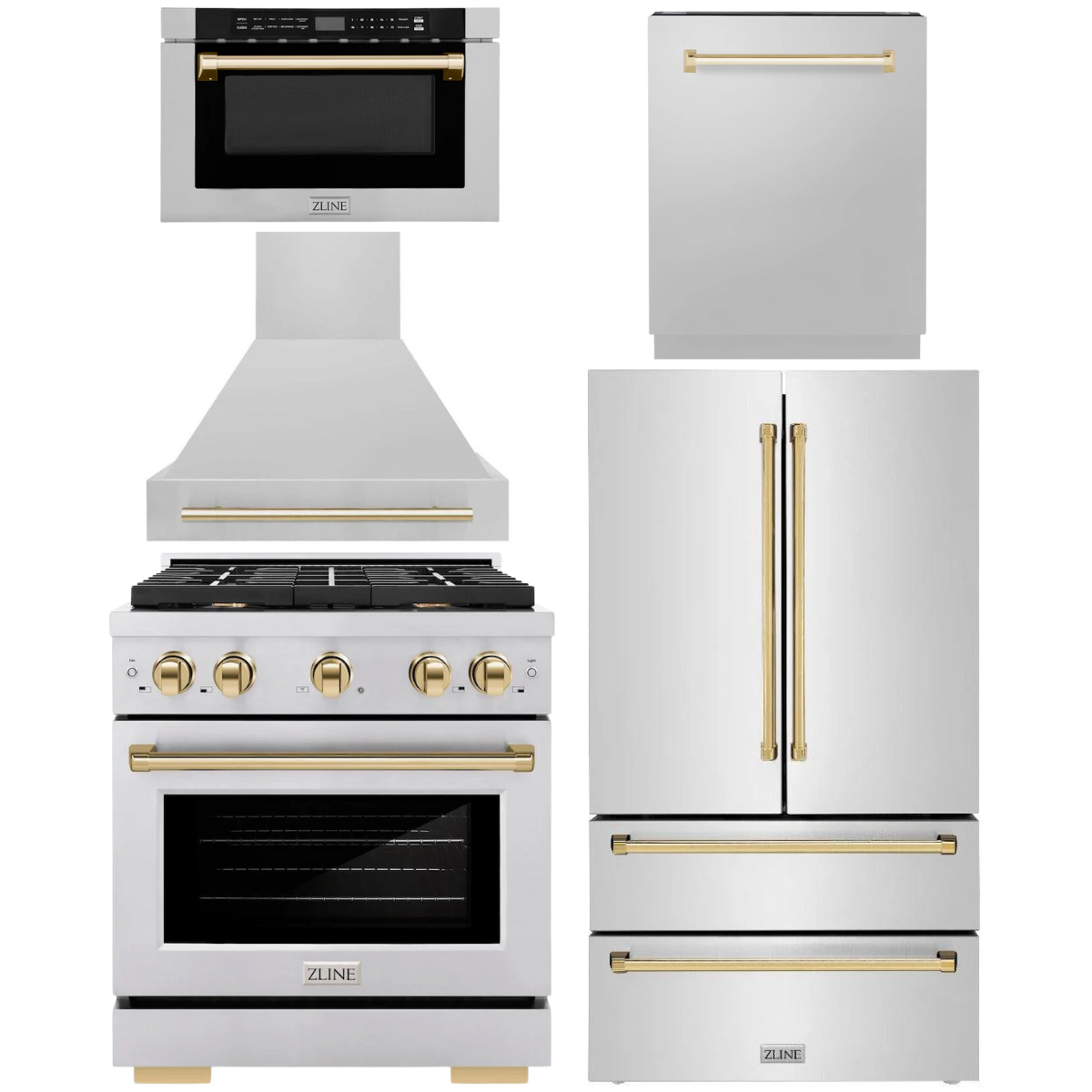 ZLINE Autograph Appliance Package - 30" Gas Range, Range Hood, 36" Refrigerator with Ice Maker, 24" Microwave Drawer and Dishwasher in Stainless Steel with Polished Gold Accents