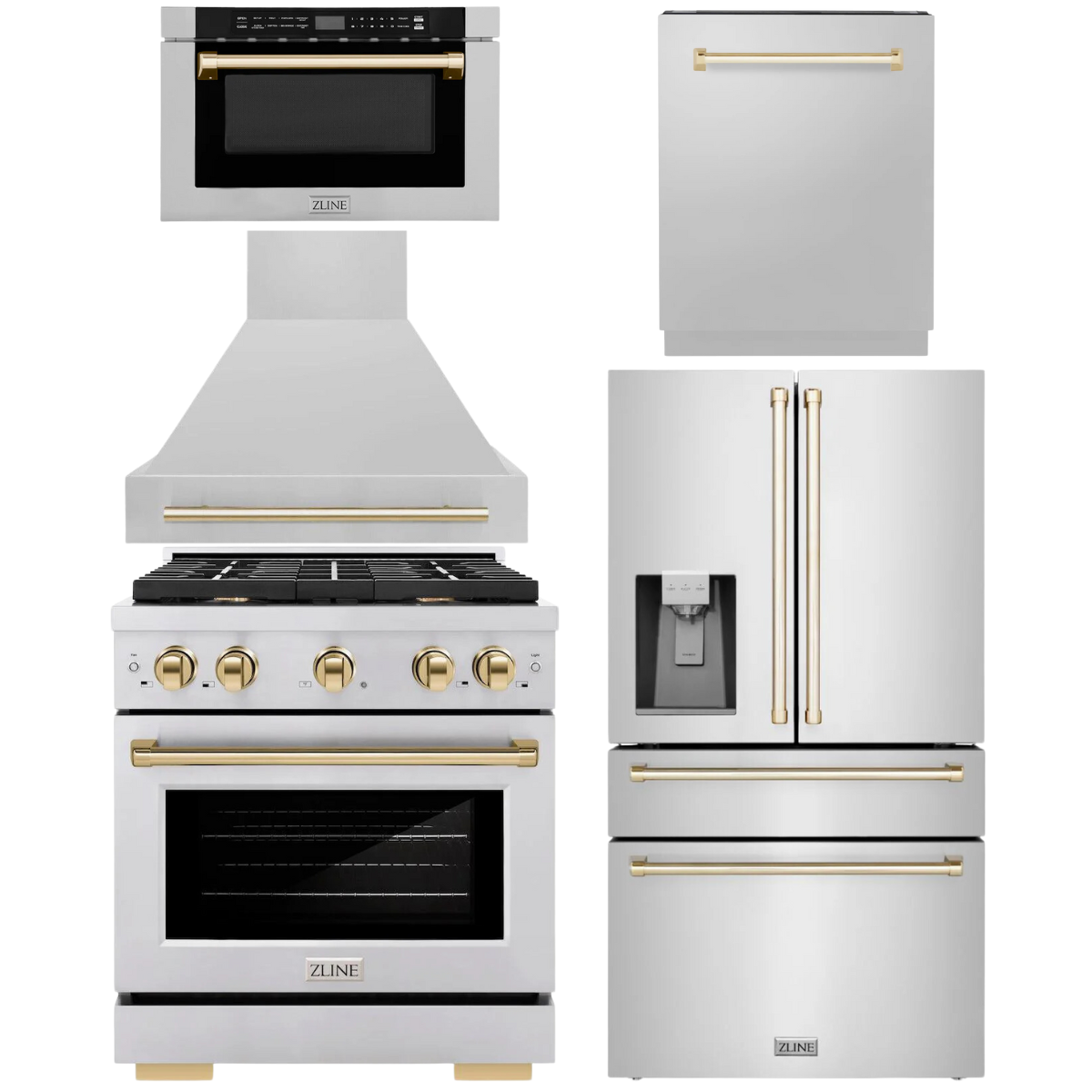 ZLINE Autograph Appliance Package - 30" Gas Range, Range Hood, 36" Refrigerator with Water/Ice Dispenser, 24" Microwave Drawer and Dishwasher in Stainless Steel with Polished Gold Accents