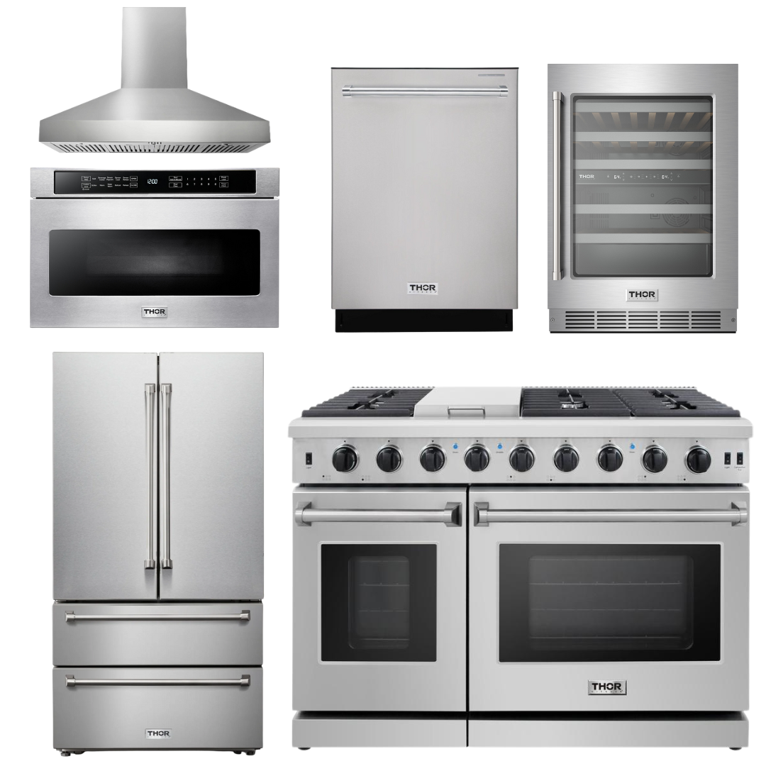 THOR Kitchen Package - 48" Gas Range, Range Hood, Refrigerator, Dishwasher, Wine Cooler, Microwave, AP-LRG4807U-W-6