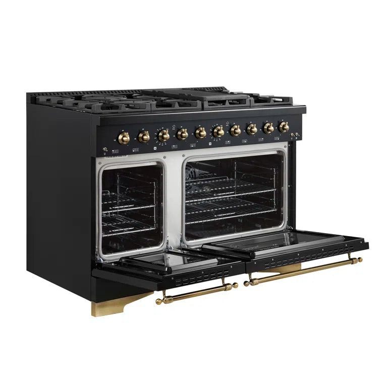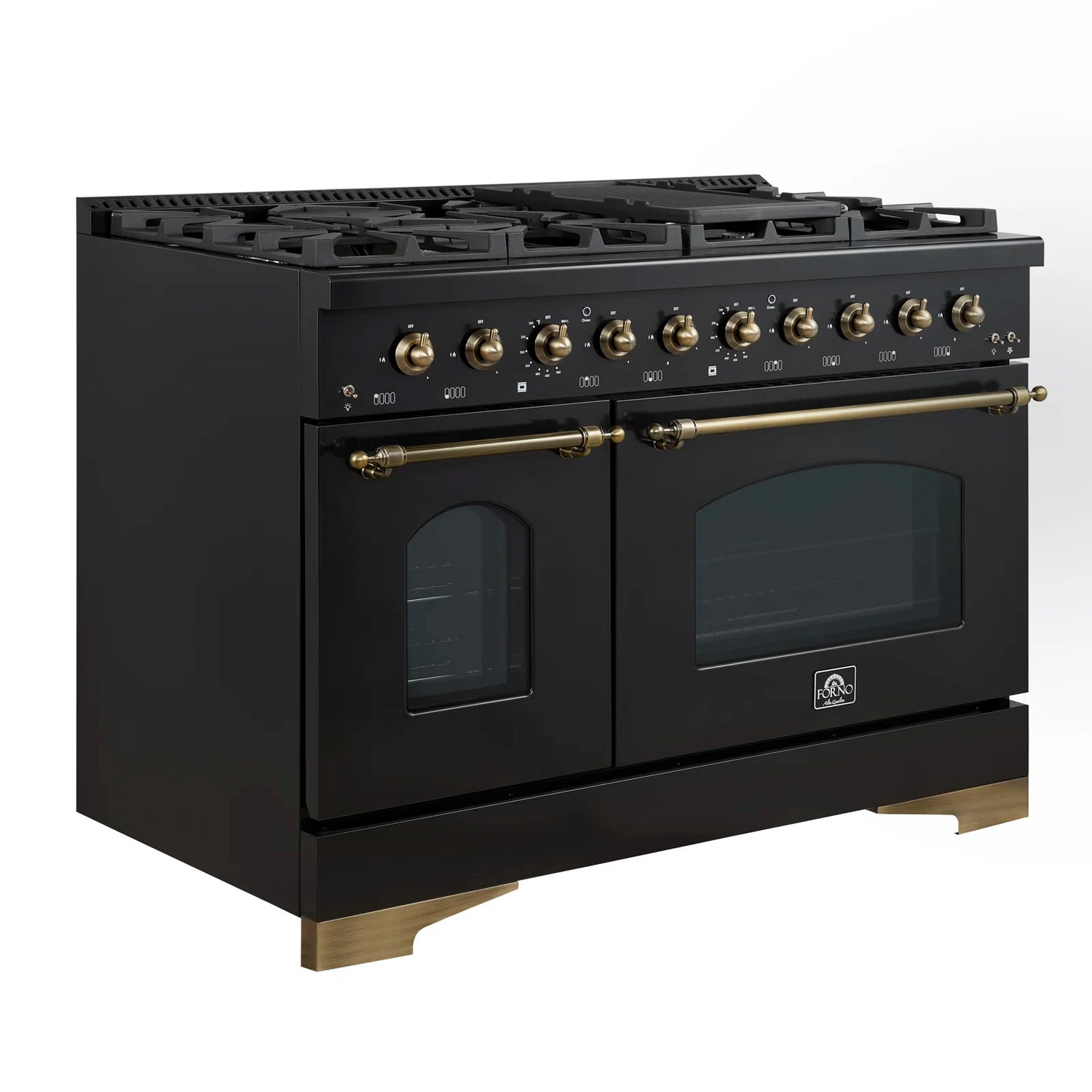 Bring style and power to your kitchen with the Forno Antico 48" Dual Fuel Range in black—where elegance meets exceptional performance. With 8 sealed burners and a total output of 94,000 BTU, it delivers the power and precision needed for any culinary challenge. The two dual-ring brass burners provide up to 20,000 BTU for high-heat searing and 1,000 BTU for simmering, delivering exceptional control. Its 3.5 cu.ft. convection oven and an additional 2 cu.ft. oven provide ample room for big family meals. The sleek black finish with antique brass accents exudes sophistication, while cast-iron grates ensure stability and durability, and recessed enamel cooktop makes cleanup effortless. This range seamlessly blends power, style, and dependable performance for an exceptional cooking experience all at an affordable price.