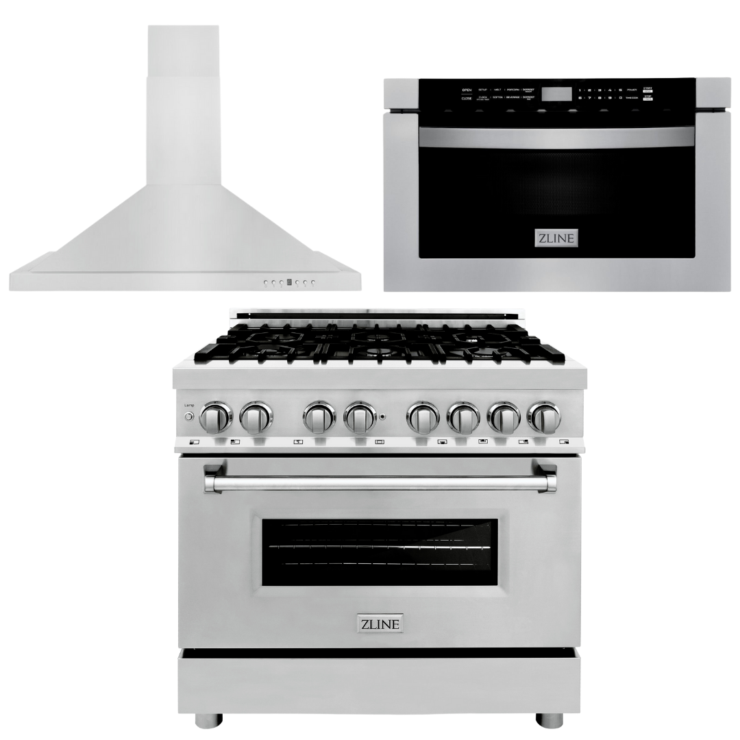 ZLINE Appliance Package - 36 in. Dual Fuel Range, Range Hood, Microwave Drawer, 3KP-RARH36-MW