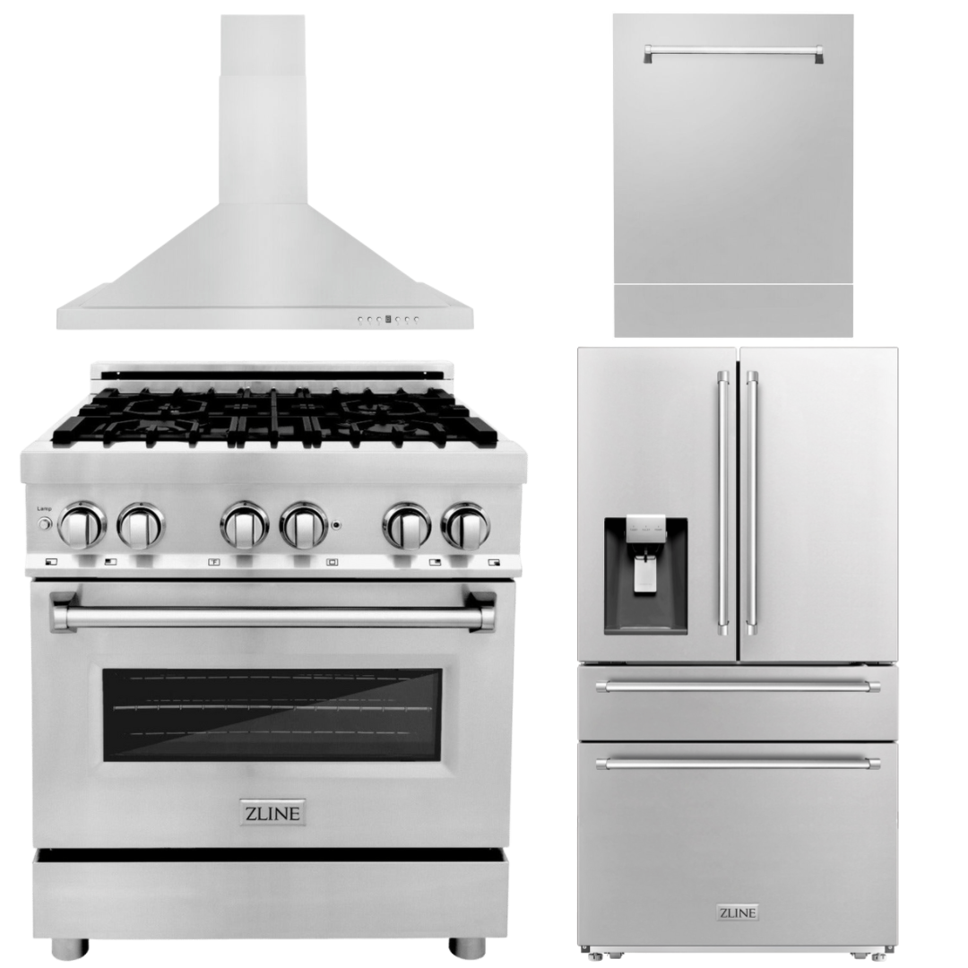 ZLINE Appliance Package - 30" Dual Fuel Range, Refrigerator with Water & Ice Dispenser, Range Hood and Dishwasher