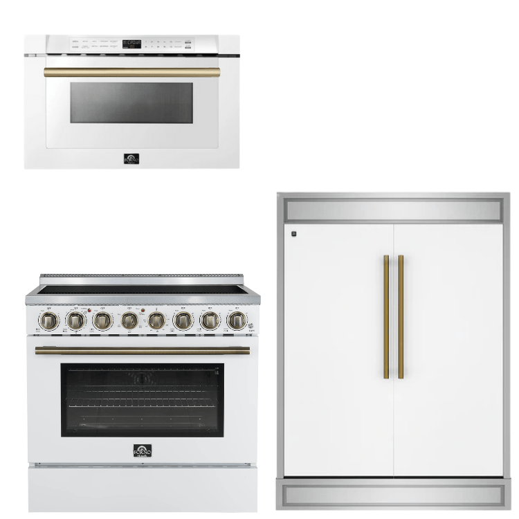 FORNO Appliance Package - 36" Electric Range, 60" Refrigerator, Microwave in White with Antique Brass Accents