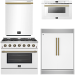 FORNO Galiano Package - 36" Gas Range, 60" Side-by-Side Refrigerator with Grill Trim, Dishwasher and 24" Microwave Drawer in White with Antique Brass Accents