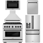 ZLINE Autograph Appliance Package - 36" Dual Fuel Range, Range Hood, 36" Refrigerator with Water/Ice Dispenser, 24" Microwave Drawer and Dishwasher in Stainless Steel with Matte Black Accents