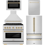 ZLINE Autograph Appliance Package - 36" Gas Range, Range Hood, 36" Refrigerator with Ice Maker, 24" Microwave Drawer and Dishwasher in Stainless Steel with Polished Gold Accents