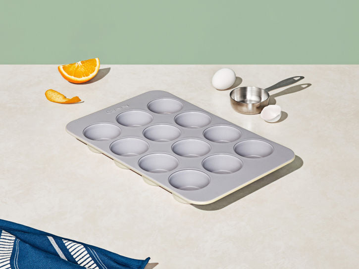 Meet the healthiest Muffin Pan by Caraway. The 12-cup Muffin Pan in Cream enables you to bake goods without any of the bads....use for all your favorites like blueberry muffins, egg-white bites, chocolate chip muffins and everything in between! Featuring a non-toxic, naturally slick ceramic coating, this durable pan makes healthy baking (and clean up) easier than ever.