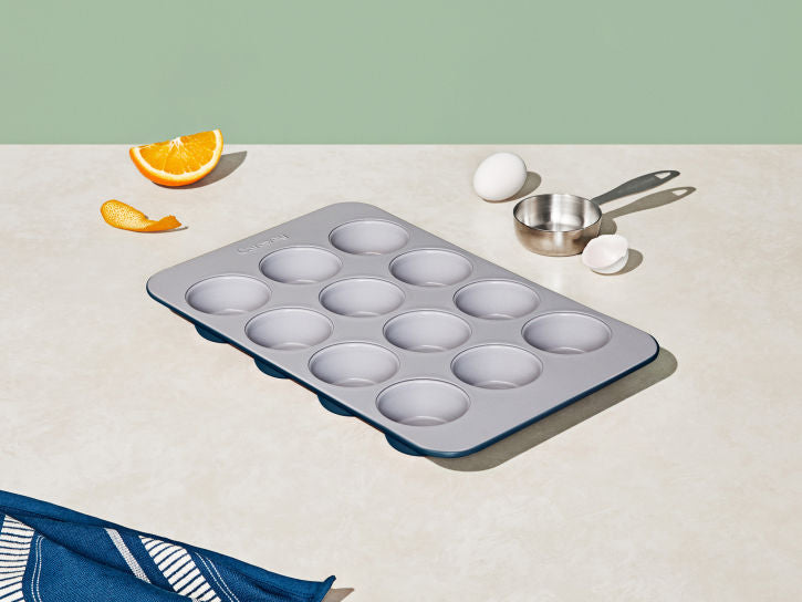 Meet the healthiest Muffin Pan by Caraway. The 12-cup Muffin Pan in Navy enables you to bake goods without any of the bads....use for all your favorites like blueberry muffins, egg-white bites, chocolate chip muffins and everything in between! Featuring a non-toxic, naturally slick ceramic coating, this durable pan makes healthy baking (and clean up) easier than ever.