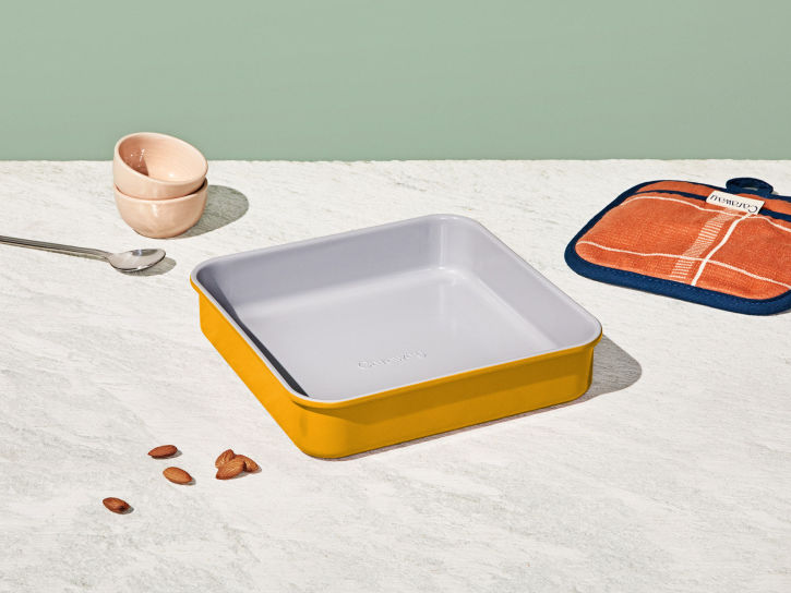 Meet the healthiest Square Pan in Marigold by Caraway. The 9" Square Pan enables you to bake goods without any of the bads: use for oat crumbles, lemon bars, and more. Featuring a non-toxic, naturally slick ceramic coating, this durable pan makes healthy baking (and clean up) easier than ever.
