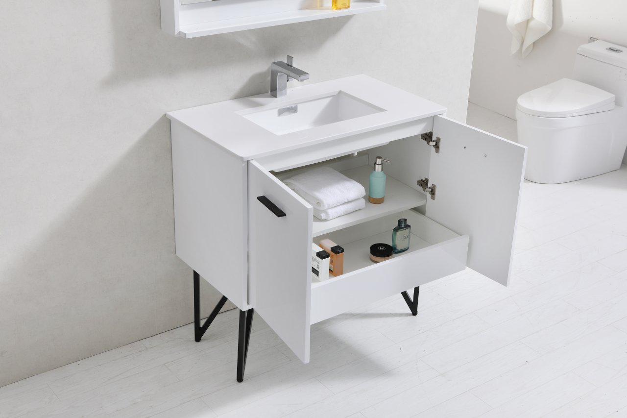 Breathe new life into your bathroom décor with the new Bosco modern Bathroom Vanity. The Bosco Vanity Set includes a Quartz Countertop, undermount reinforced acrylic sink. This Vanity features two doors and a nested drawer.