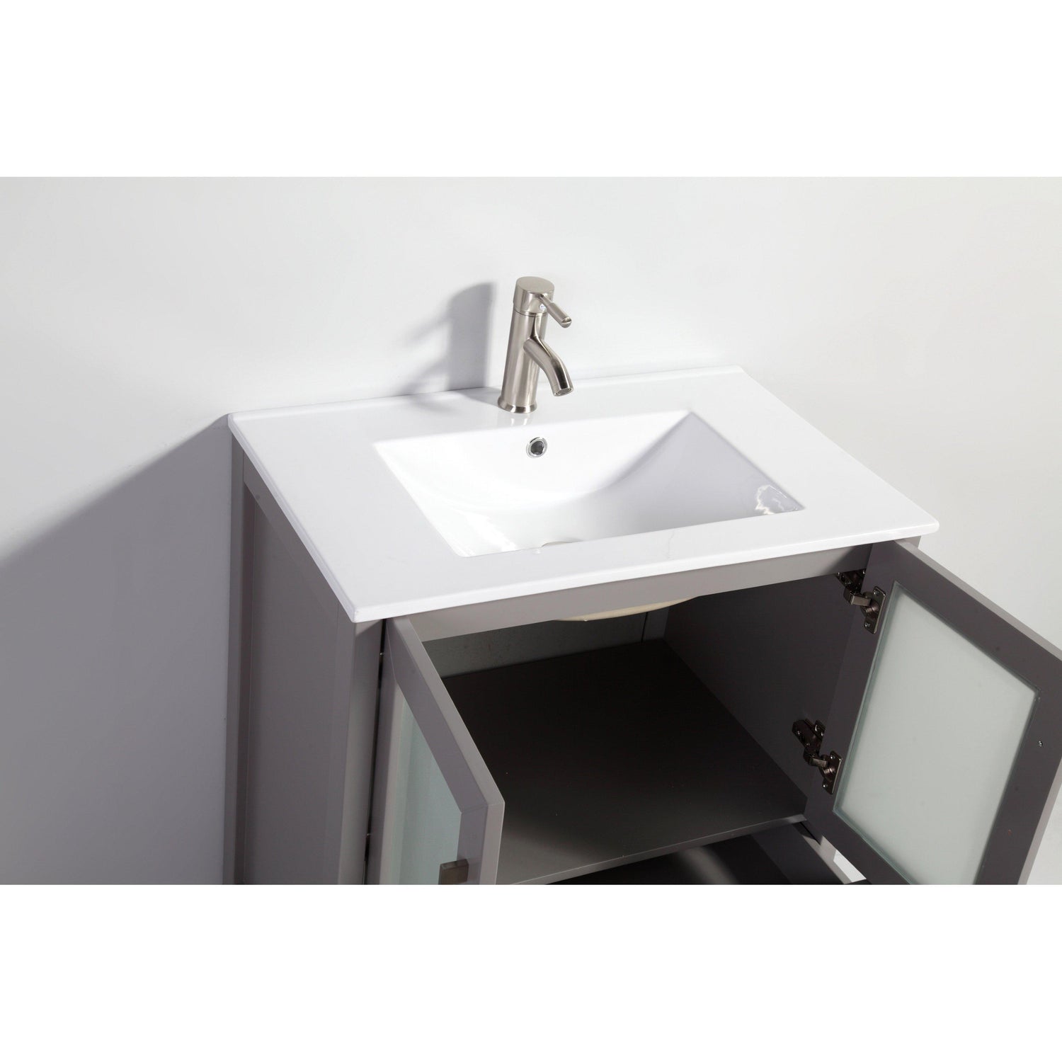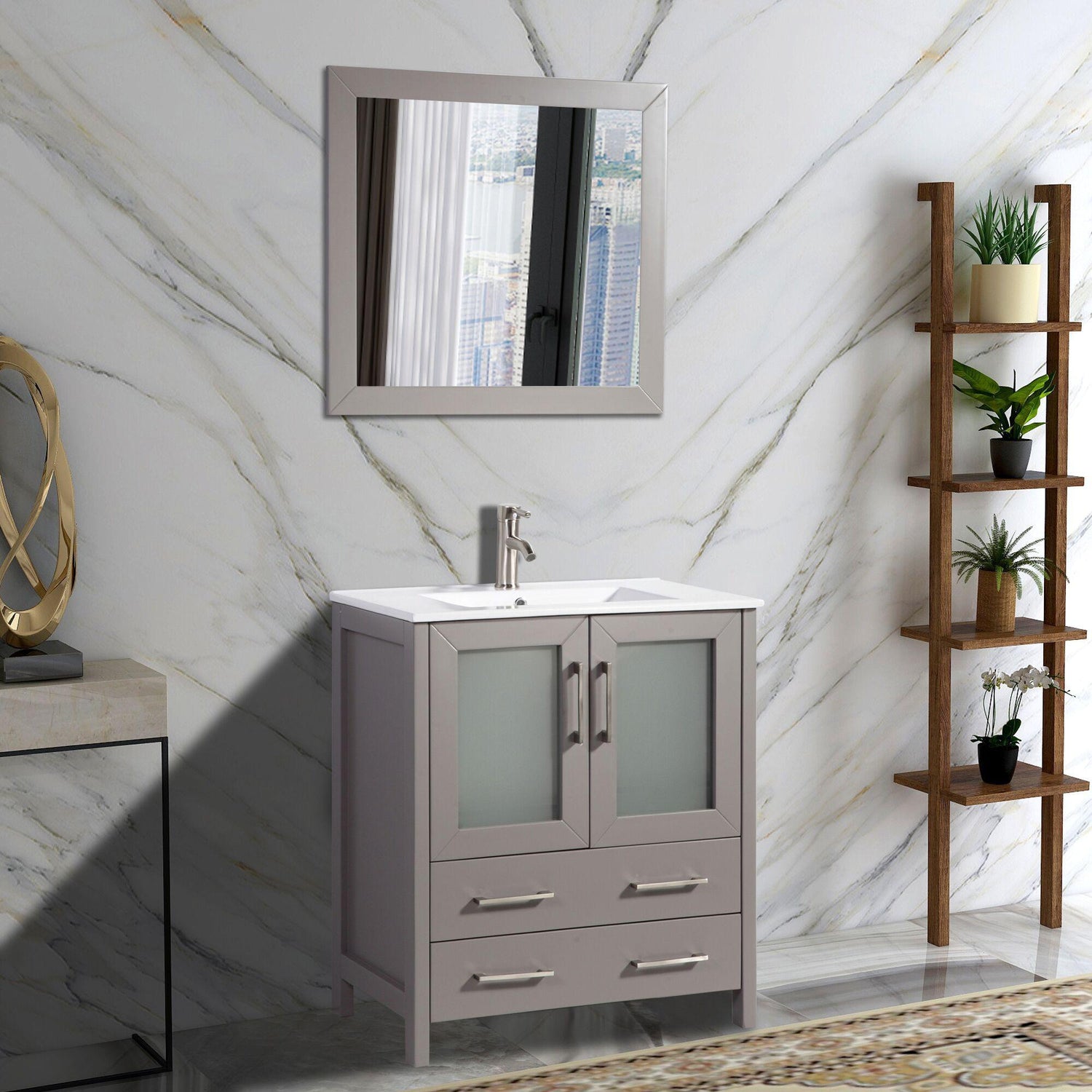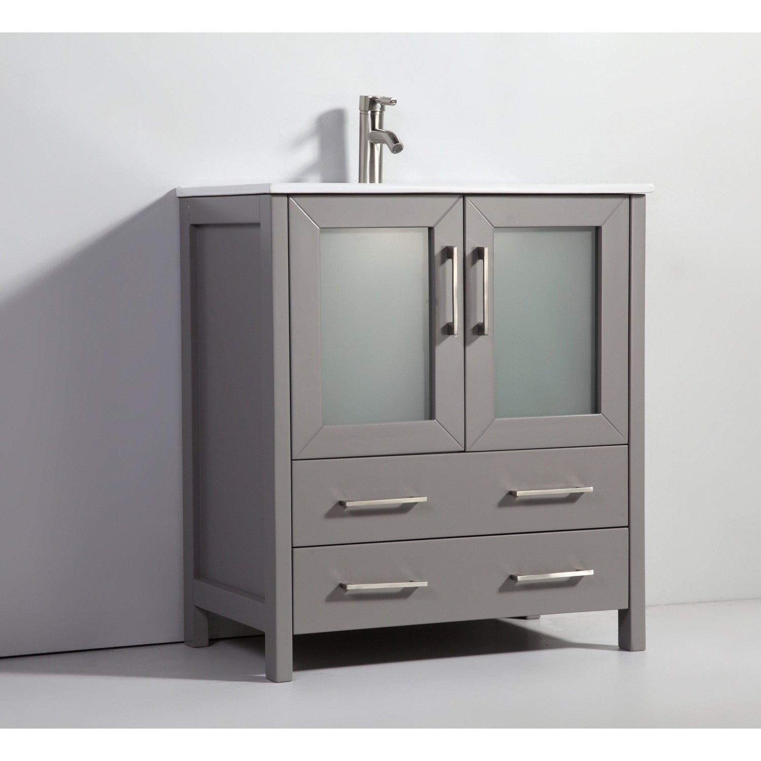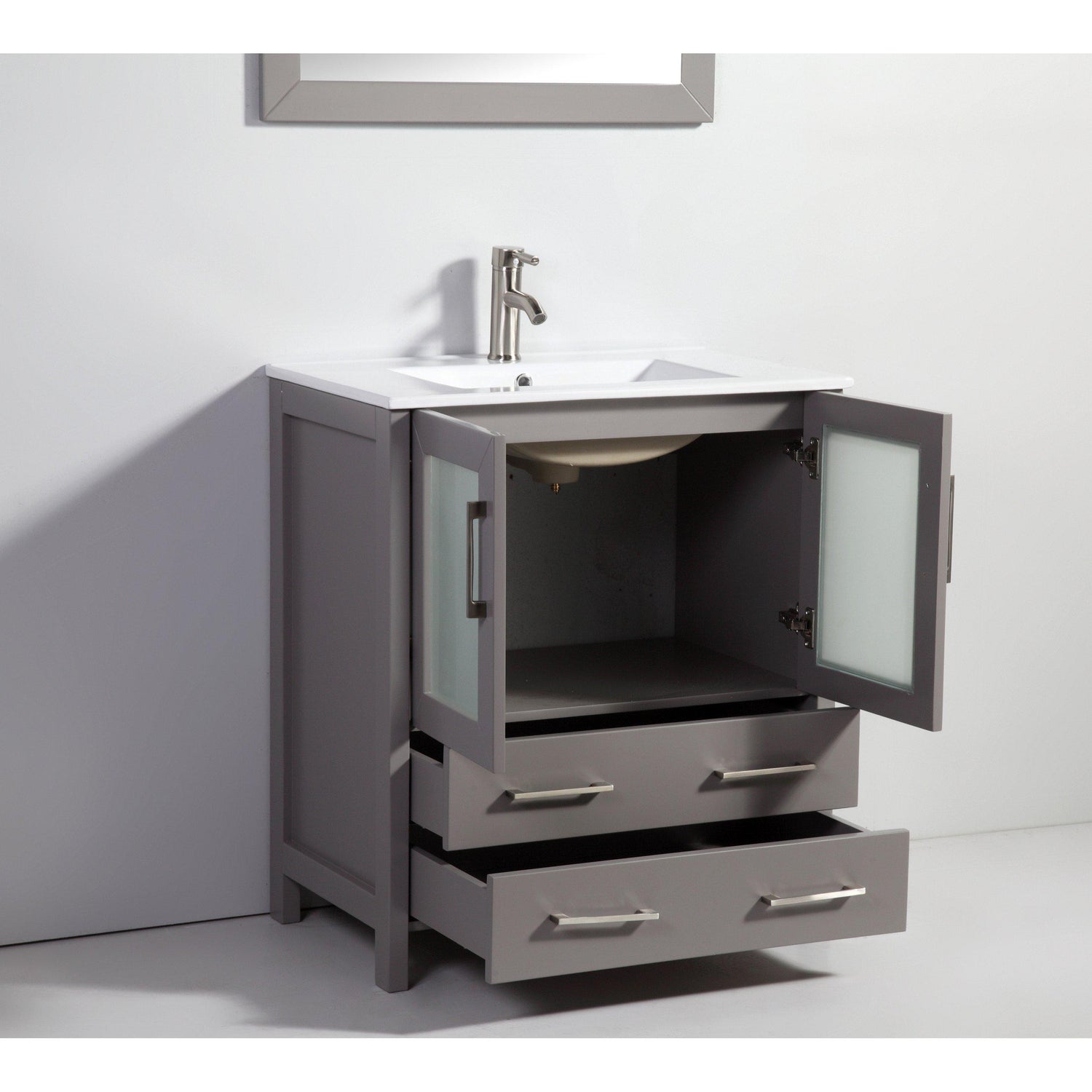 This modern 30 in. single sink bathroom vanity set with ceramic vanity top is a perfect combination of elegance and value. The soft-closing doors and drawers add another touch of class. The vanity set includes the vanity, sink, top, mirror and cabinet hardware.