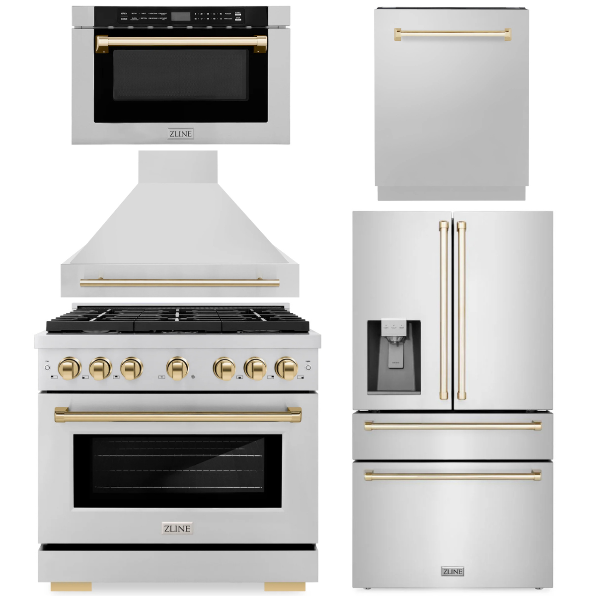 ZLINE Autograph Appliance Package - 36" Gas Range, Range Hood, 36" Refrigerator with Water/Ice Dispenser, 24" Microwave Drawer and Dishwasher in Stainless Steel with Polished Gold Accents