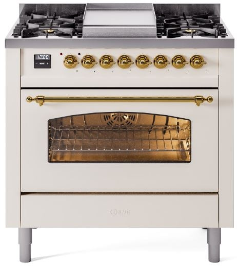 ILVE Nostalgie II 36" Dual Fuel Natural Gas Range in Antique White with Brass Trim, UP36FNMPAWG